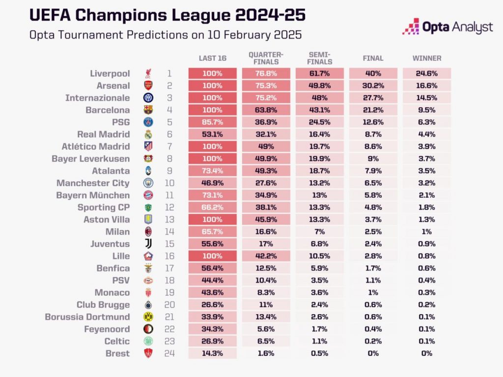 Opta Sport statistik portali klublarning joriy mavsumda Chempionlar Ligasida g’alaba qozonish imkoniyatlarini baholab chiqdi.