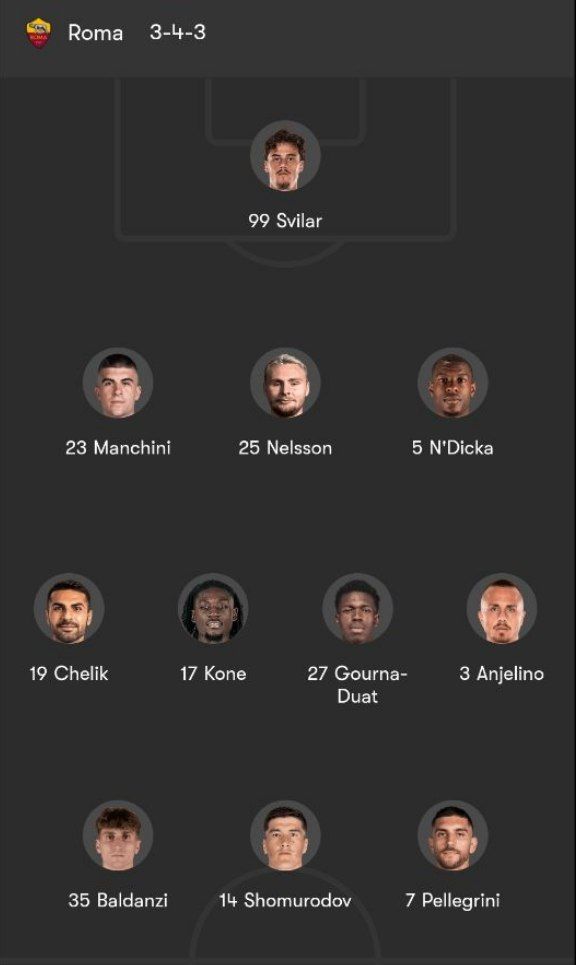 “Roma”: Svilar, Rensh, Manchini, N’Dikka, Salemakers, Kone, Paredes Pellegrini, Anxelinyo, Dibala, Shomurodov.