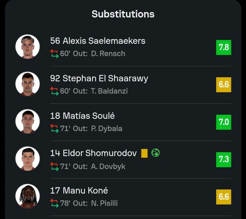 Rimliklarning birinchi goli muallifi Anxelinyo 7,4 ball bilan “Roma”ning o‘yindagi eng yaxshi 3-futbolchisiga aylandi. Artyom Dovbik 6.5 ball bilan rimliklarning o‘yindagi eng yomon baholangan futbolchisi bo‘ldi.
