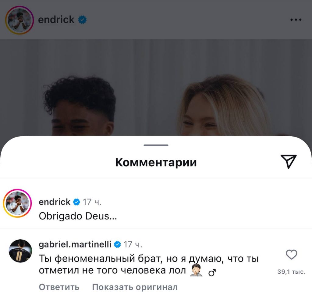 Madridning “Real” klubi hujumchisi Endrik Instagram sahifasiga joylashtirgan postlarining birida rafiqasi Gabrielani belgilamoqchi edi, lekin manzilda biroz adashib, Gabriel Martinellini belgilab qo’ydi.
