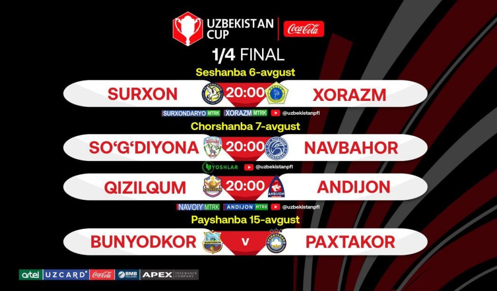 O'zbek sporti O’zbekiston kubogi. Chorak final bahslarining boshlanish vaqtlari ma’lum Chop etilgan: 28 Iyul 2024 18:28 Nasrullo Ulashish Ulashish O’zbekiston kubogi chorak final bahslari taqvimi e’lon qilindi. AllSport24.uz'ning Telegram kanaliga obuna bo'ling! Parij-2024. Svetlana Osipova yarim finalda! Parij-2024. Bugun qaysi sportchilarimiz bahslarga kirishadi Parij-2024. Safina Sadullayeva ishtirokini yettinchi o’rinda yakunladi Parij-2024. Diyora Keldiyorova Olimpiada chempioni Parij-2024. Bugun qaysi sportchilarimiz bahslarga kirishadi Maqolani ulashish Facebook Telegram Copy Link Ulashish Oldingi maqola Parij-2024. Nigeriyalik bokschi Olimpiadadan chetlatildi Keyingi maqola Aspinall Jon Jonsni jangga chorladi Leave a review Leave a review Javobni bekor qilishEmail manzilingiz chop etilmaydi. Majburiy bandlar * bilan belgilangan Please select a rating! Your Rating Rate… Perfect Good Average Not that Bad Very Poor Your comment *Your name * Your Email * Your website Keyingi marta fikr bildirishim uchun bu brauzerda mening ismim, email va saytim manzili saqlansin. Bizni kuzating10KObunachilarObuna bo'ling10KObunachilarObuna bo'ling10KObunachilarObuna bo'ling10KObunachilarObuna bo'ling10KObunachilarObuna bo'lingSo'ngi yangiliklar Ronaldu mintaqadagi vaziyat keskinlashgani sababli Saudiya Arabistonini tark etdi Futbol Formula-1 yulduzi Sharl Lekler uylandi (fotogalereya) Jahon sporti Deklan Raysning qo‘l bilan o‘yini uchun nega penalti berilmadi? Mutaxassis vaziyatga izoh berdi Futbol UEFA «Tottenhem»ni muxlislarning xatti-harakatlari sabab jarimaga tortdi Futbol