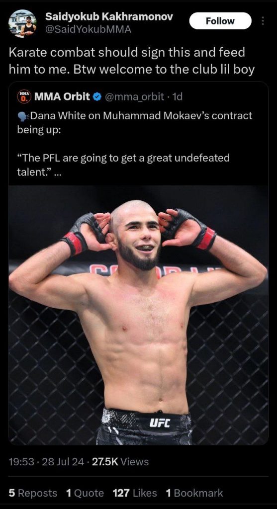 “Karate Combat uni o’z safiga qo’shib, men bilan jang tashkil qilishi kerak. Ha aytgancha, klubga xush kelibsan bolakay”, – deya izoh qoldirdi Qaxramonov o’zining X sahifasida.