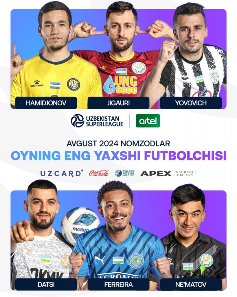 O’zbekiston Superligasida avgust oyining eng yaxshi futbolchisi bo’lish uchun nomzodlar ro’yxati e’lon qilindi. Bu haqda O’zPFL matbuot xizmati xabar berdi.