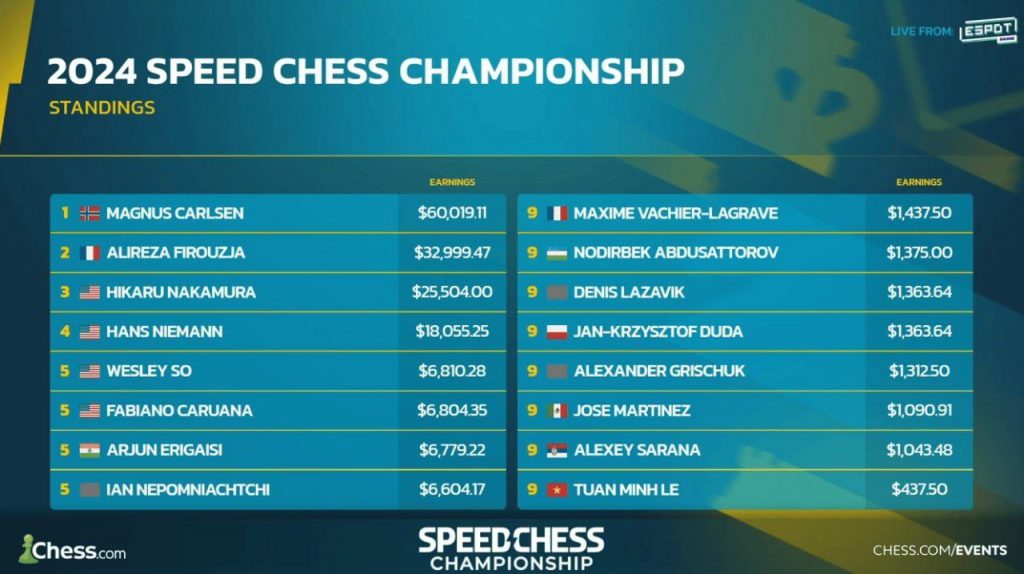 Norvegiyalik grossmeyster Magnus Karlsen “Speed Chess Chempionship 2024”da g’olib chiqdi. Musobaqa finalida unga taniqli fransiyalik grossmeyster Alireza Firuzja raqiblik qildi.