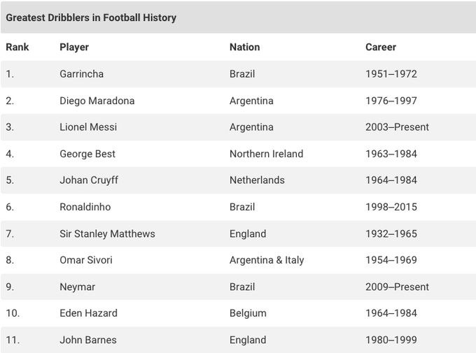 Ro’yxatning birinchi o’rnini afsonaviy braziliyalik vinger Garrincha egalladi. Ikkinchi o’ringa Messi loyiq deb topildi, kuchli uchlikni esa Diyego Maradona yakunlab berdi.