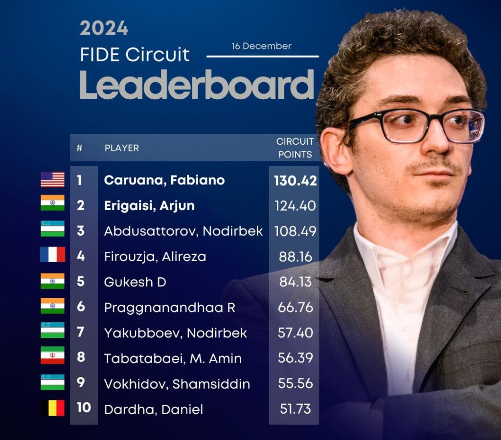 Yangilangan FIDE Circuit reytingiga ko’ra, amerikalik grossmeyster Fabiano Karuana 130,42 ball peshqadamlik qilmoqda.