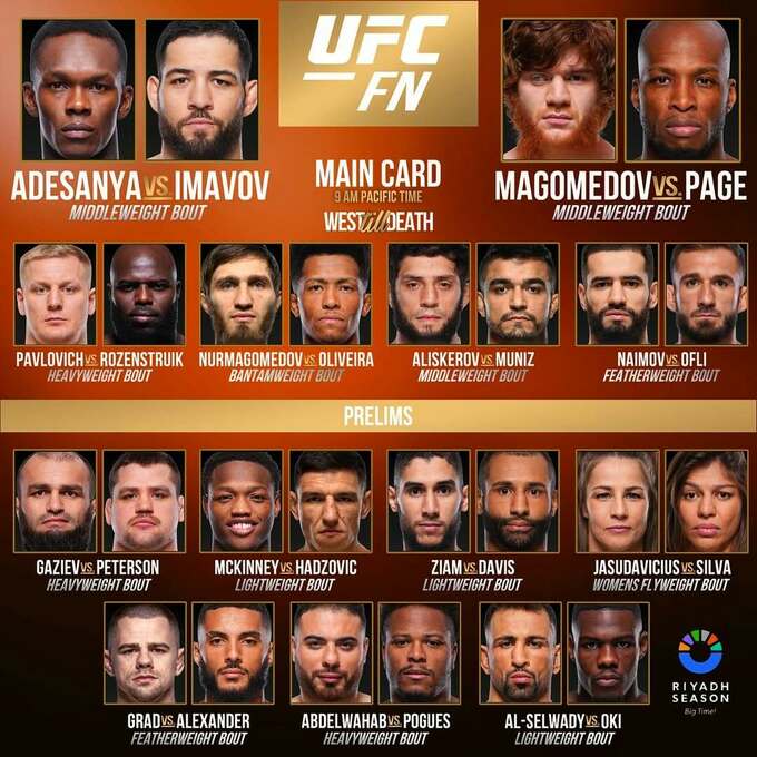 Musobaqaning asosiy bahsida o’rta vazn toifasida sobiq chempion Israel Adesanya va divizionning umidli vakili Nassurdin Imavov jang qiladi.